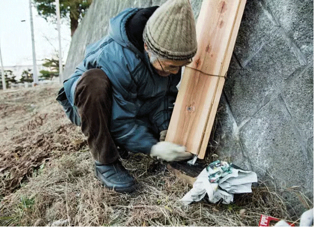 這是一個美術館。在日本,如果房子外牆抹上這種土,每當下雨過後土層受凍就會產生皸裂。但是因為我很想要土壤在牆上的效果,我用了一種仿真土。我還在土裏加了稻稈以製造紋理。我往裏面加了一些真土,這樣整體就顯得更自然一些。我一直在用不同的材料實驗來達到我想要的效果。