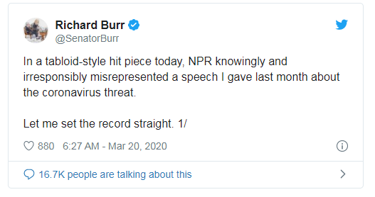 美國國家公共電台在當地時間19日稱,根據一份”秘密通話記錄“,有證據顯示參議院情報委員會主席理查德·伯爾(Richard Burr,RN.C.)在三週前的聚會上,就已經向一小部分”高級選民“發出了疫情將在美國大範圍蔓延的警告。而關於疫情的實際風險,他從未提供給普通民眾。