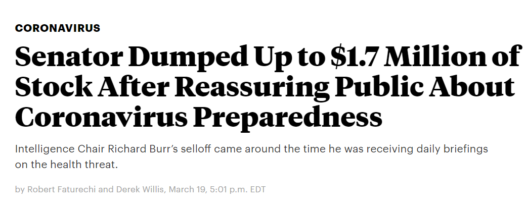 另外一份來自非官方新聞機構 ProPublica的爆料,在伯爾向公眾保證政府已準備好應對冠狀病毒之後不久,他本人便在2月13日的股市高位出售了價值62.8萬至172萬美元的股票。因此,他“巧合地”避開了近期美國市場的歷史性崩盤。