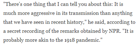 但是,就在當日,在“國會山俱樂部”(Capitol Hill Club)的社交午宴上,伯爾就已經向一小部分人表示:“(新冠肺炎)類似於1918年流感,有從所未見的侵略性。”