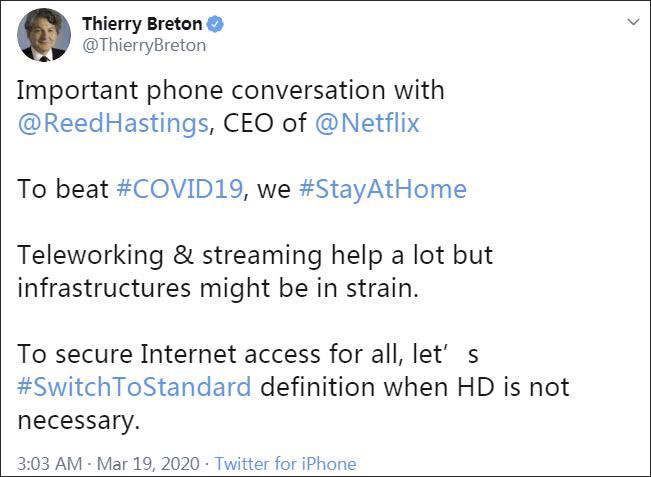 3月19日,布雷頓通過推特披露了雙方的這次對話並稱:為了抗擊疫情大家都呆在家裏,線上工作和流媒體幫了很大忙,但是網絡設施也許會不堪重負。他呼籲用户:為保證所有人都能上網,不是必要情況,就別看高清視頻了,我們看標清吧。