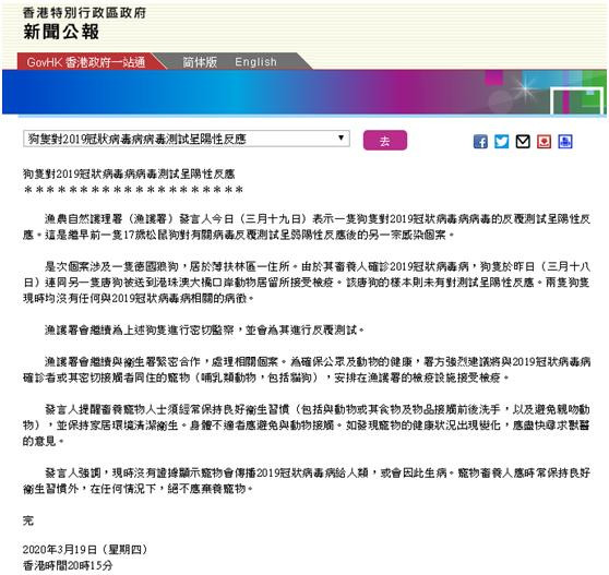 公報稱,香港漁護署會繼續與衞生署緊密合作,處理相關個案。為確保公眾及動物的健康,署方強烈建議將與新冠肺炎確診者或其密切接觸者同住的寵物(哺乳類動物,包括貓狗),安排在漁護署的檢疫設施接受檢疫。