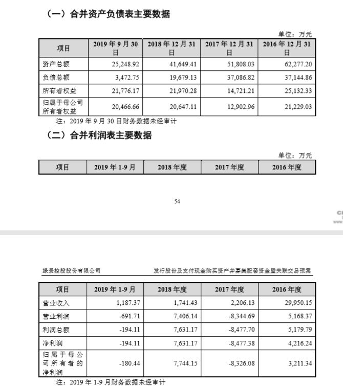 據重組方案顯示,綠景控股2017年、2018年、2019年1-9月,分別實現營收2206萬元、1741萬元、1187萬元;實現歸母淨利潤-8326.08萬元、7744.15萬元、-180.44萬元。除此之外,綠景經營性現金流淨額常年為負。