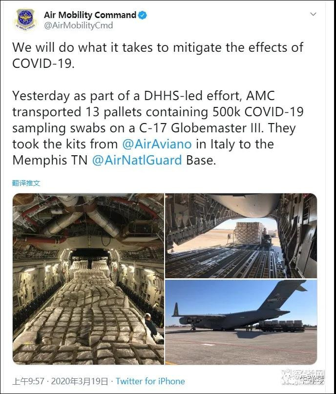 現在,有圖有真相,在意大利最緊急的時刻,美國從意大利空運走了50萬個檢測採樣拭子。