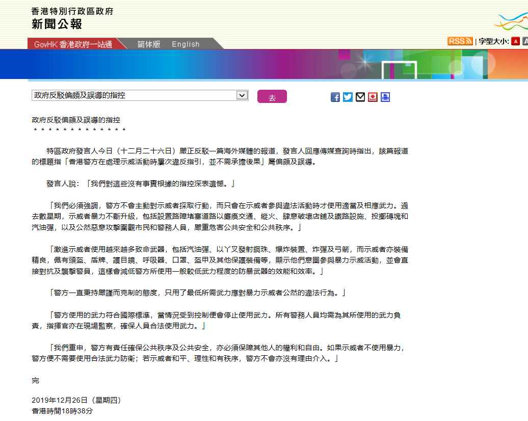 2019年12月26日,《華盛頓郵報》發佈抹黑港警的報道,港府嚴正反駁,批該文章偏頗誤導、沒事實根據。