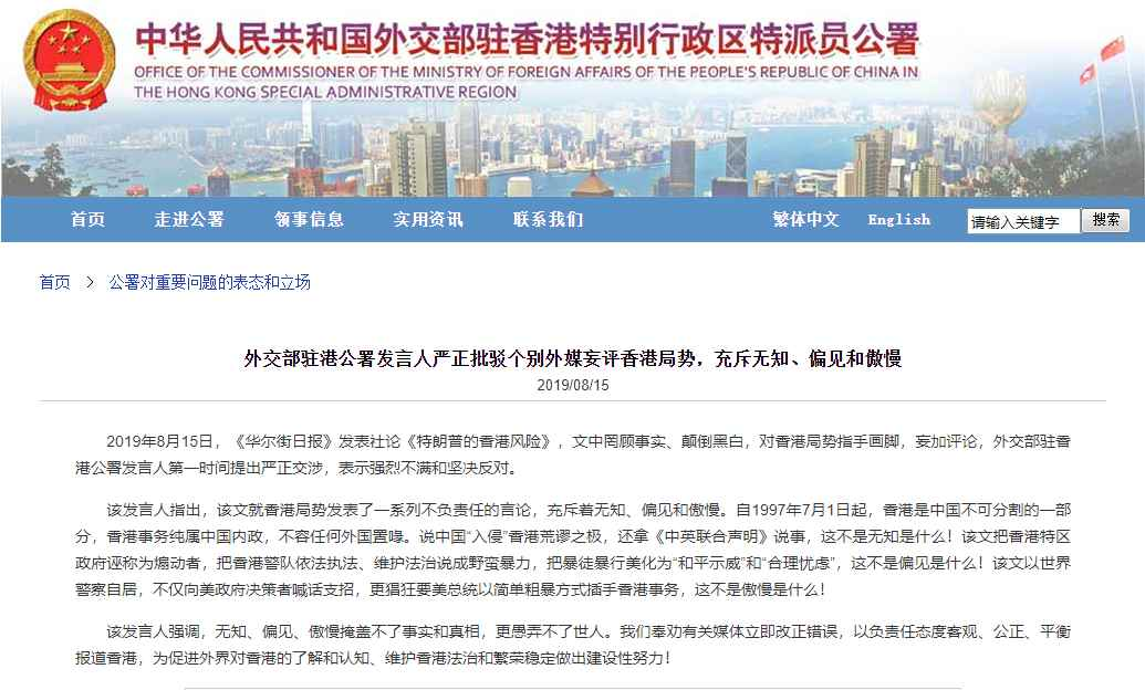 2019年8月15日,《華爾街日報》發表社論《特朗普的香港風險》,文中罔顧事實、顛倒黑白,對香港局勢指手畫腳,妄加評論,外交部駐香港公署發言人第一時間提出嚴正交涉,表示強烈不滿和堅決反對。