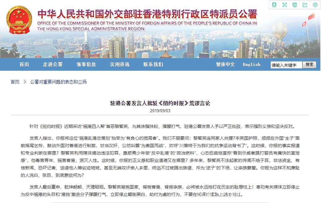 2019年9月3日,針對《紐約時報》近期採訪“禍港四人幫”首惡黎智英,為其塗脂抹粉、撐腰打氣,駐港公署發言人予以嚴正批駁,表示強烈義憤和堅決反對。