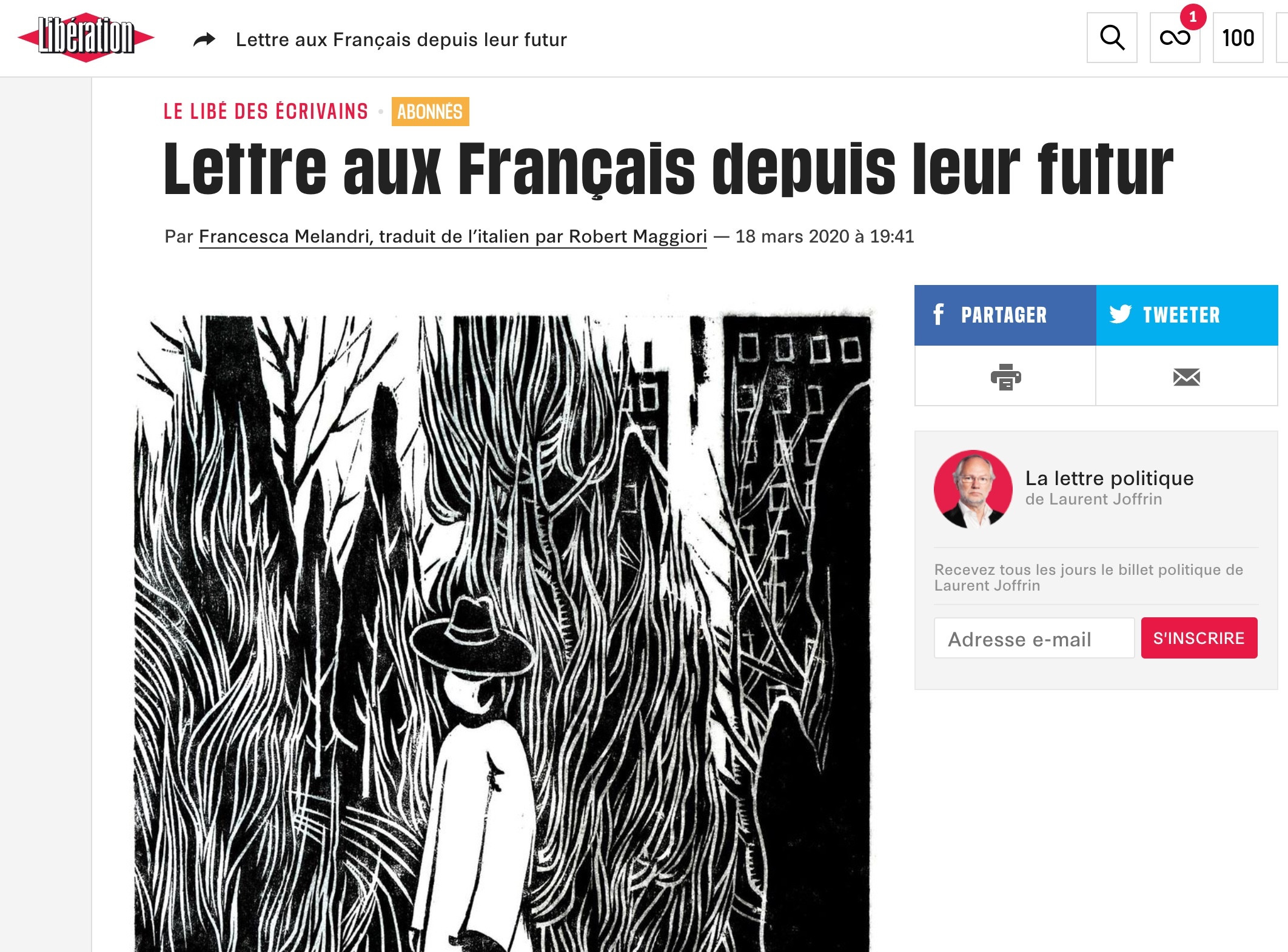 2020年3月18日,法國《解放報》刊登了一篇由意大利作家弗朗切斯卡•梅朗德里(Francesca Melandri)從過來人的角度寫給法國人的一封信,從意大利語到法語的譯者為羅貝爾•馬齊奧裏(Robert Maggiori)。復旦大學哲學學院教師王春明將法文翻譯成了中文,以供中國讀者共賞。