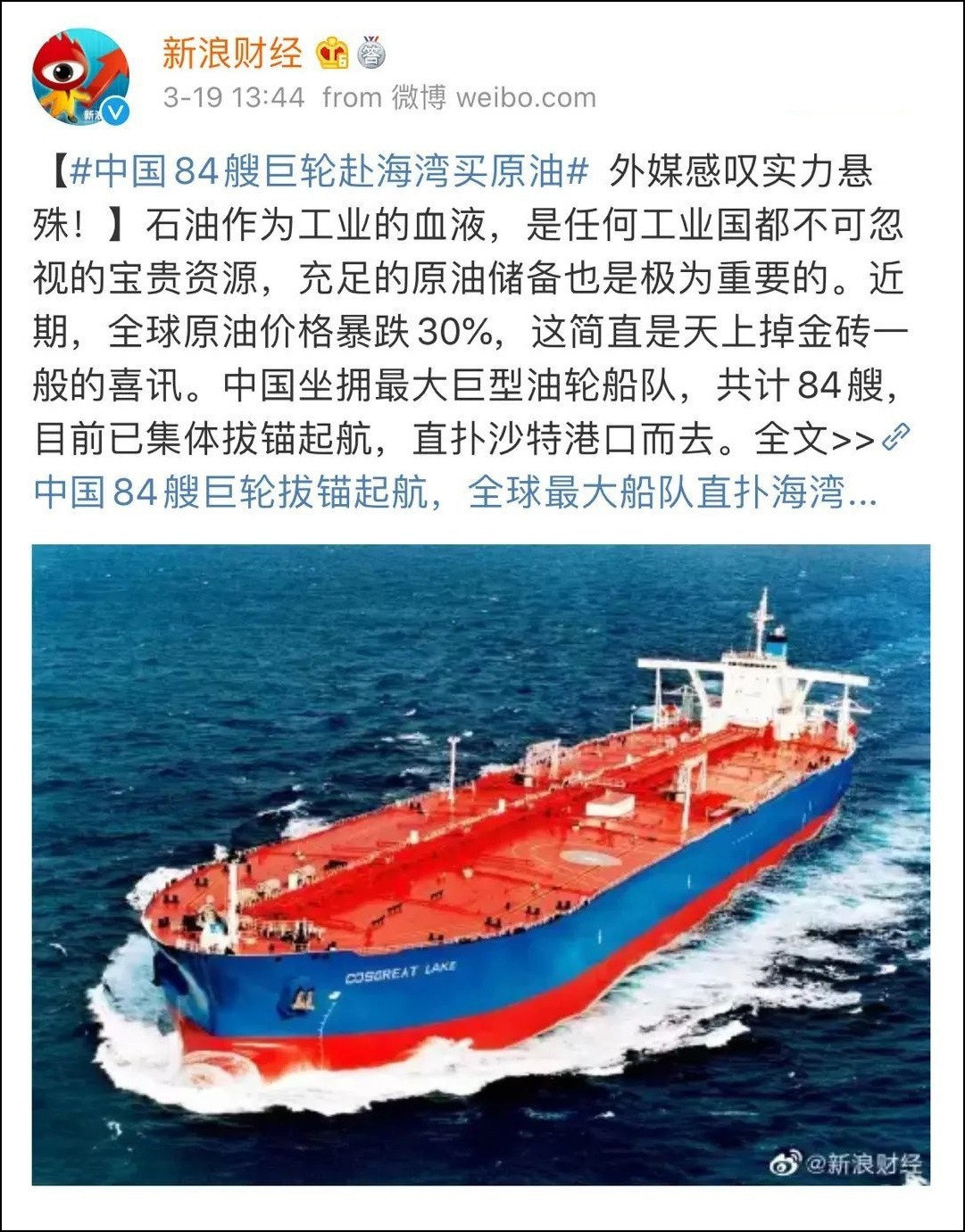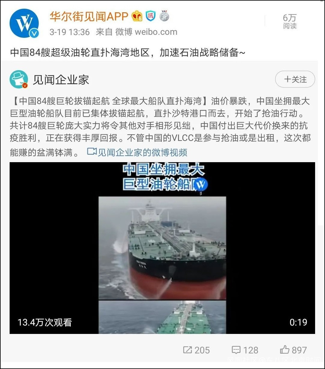 文中説,由於沙特和俄羅斯展開激烈的石油價格戰,導致全球原油價格暴跌,中國立刻派出84艘超大型原油運輸船(VLCC)開往海灣地區“搶貨”。