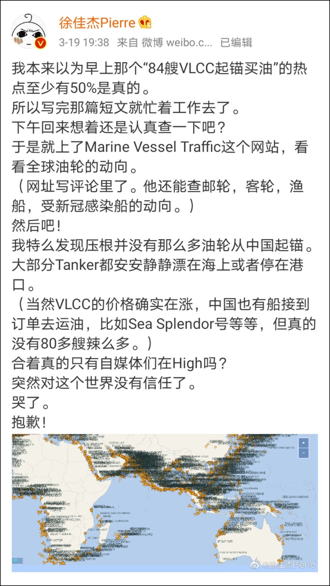 其次,網傳文章説“據中國海事融媒體的最新視頻信息顯示,一天前,全國各港口的VLCC集體拔錨,開始了搶油行動。”這裏有兩個問題。第一是“中國海事融媒體”這家機構。