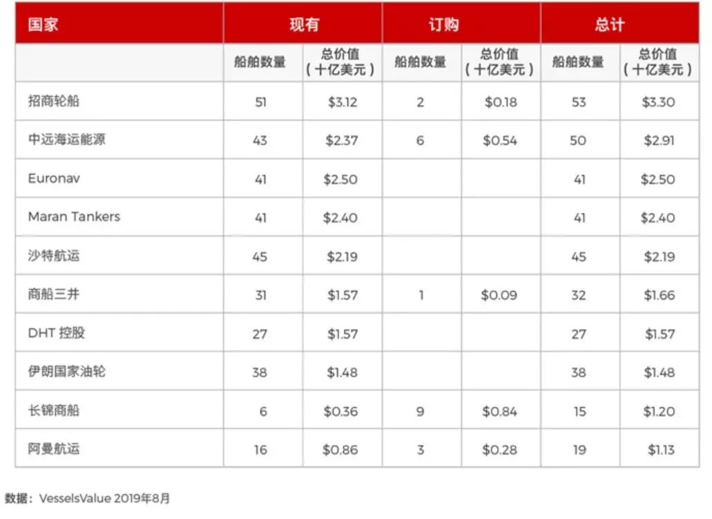 **依據知名船舶數據提供商VesselsValue於2019年8月提供的數據,招商輪船擁有VLCC共51艘,訂單2艘;中遠海能擁有VLCC共43艘,訂單6艘。**假設兩家公司8艘訂單全部交付,則可得出這兩家公司目前擁有VLCC共102艘。