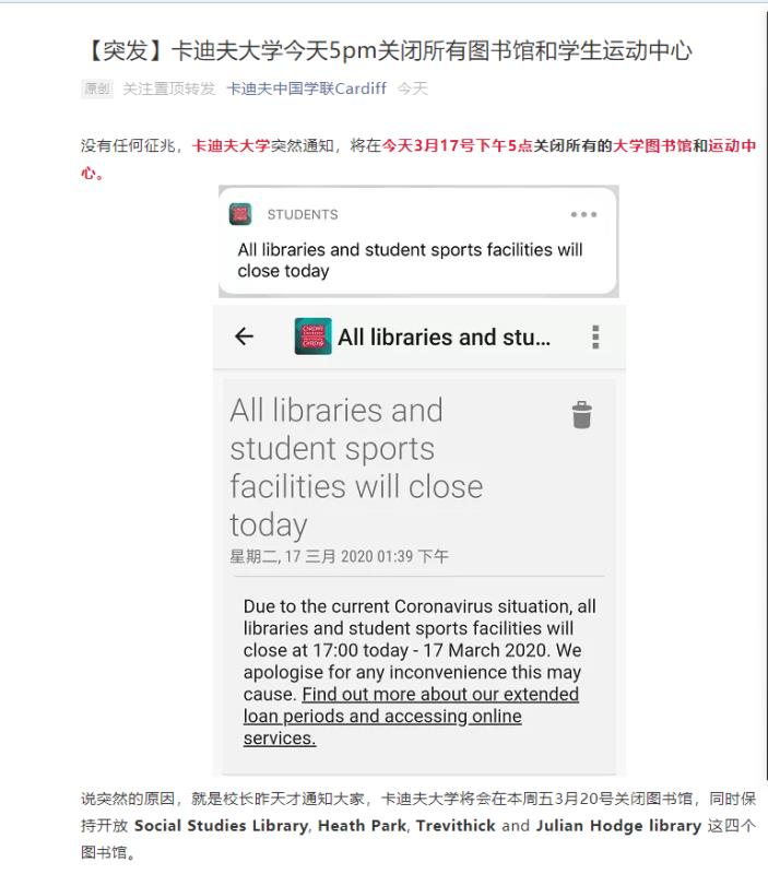防控措施正在步步收緊。前幾天,柳琦告訴記者“今天,我們大學終於開始行動了。”——3月17日17時,卡迪夫大學關閉大部分學校圖書館和運動中心。其實,雖然學校沒有統一強制,但在前兩天,有個別學院就開始自行停課了。
