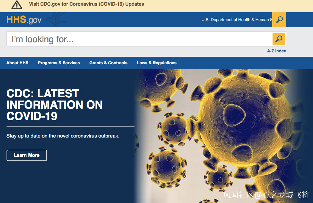 再來看美國公共衞生與服務部,官網介紹該部門的職能是保護所有美國人的健康,提供有效的健康服務,並促進醫學、公共衞生和社會服務的進步。目前,該網站首頁醒目地顯示新冠病毒的專題頁面,不過點擊之後,直接跳轉到了疾控中心網站。