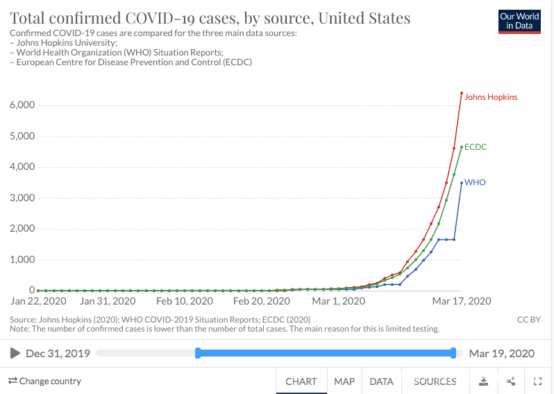 由牛津大學創立的“用數據看世界”(Our World in Data)網站解釋,他們在監測全球各國新冠疫情數據時,最初參照3個數據源:世衞組織、歐洲疾病預防控制中心(ECDC)以及霍普金斯大學。目前他們已經放棄從世衞組織獲取數據,一方面是因為世衞在3月18日修改了每日統計截止時間,另一方面在於其數據庫曾出現過錯誤。