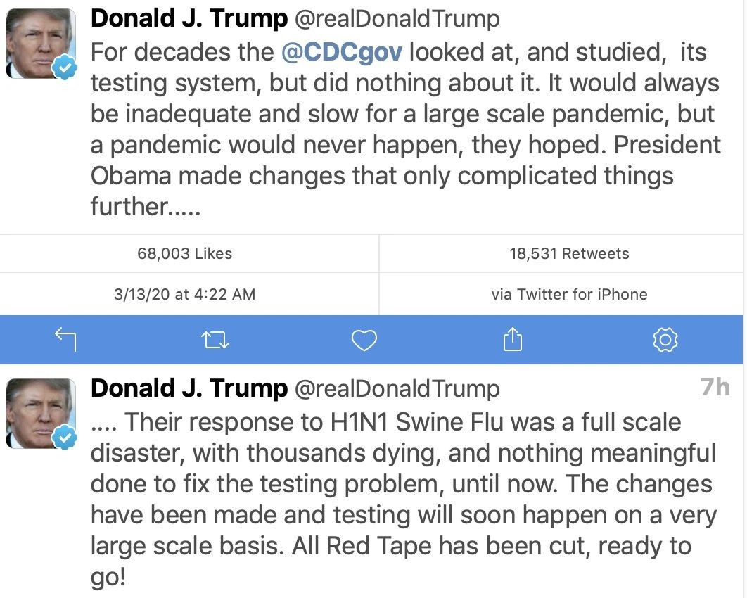 特朗普還在推特上以H1N1流感疫情為例,稱疾控中心在應對H1N1流感時就是“一場大規模的災難,造成數千人死亡,至今未解決檢測問題。”