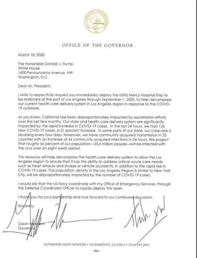 對此,加州州長要求川普在9月1日之前將“仁慈號”駐紮在洛杉磯港,“這艘船有助於降低醫療系統的壓力,使洛杉磯地區能夠滿足緊急醫療的關鍵需求”。