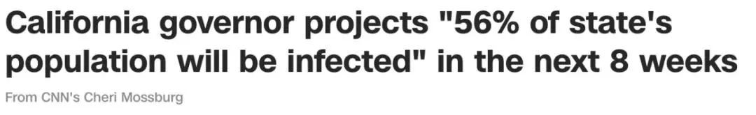 昨日,加州州長Gavin Newsom在給特朗普的一封信中表示,在未來8周,加州預計會有56%的人感染新冠狀病毒(約2550萬)。“在過去的24小時內,我們有126例確診病例,增長了21%。在加州某些地區,我們的確診率每天翻一番”。