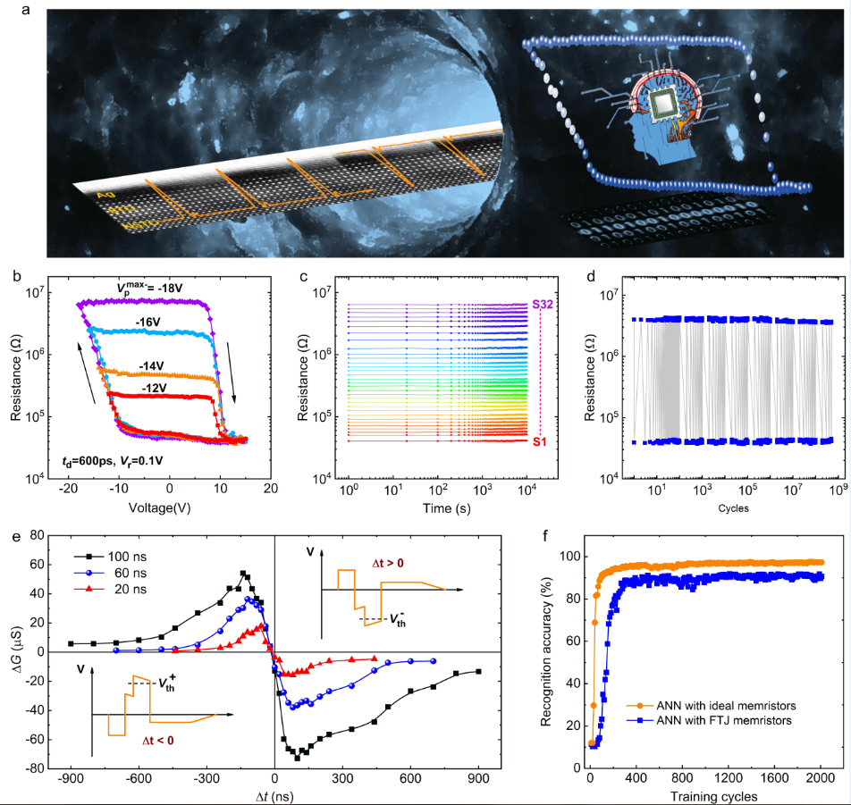 圖例説明:鐵電隧道結憶阻器的阻變特性和神經形態模擬計算。a. 鐵電隧道結量子隧穿效應概念示意圖。b. 施加不同幅值的600ps電脈衝實現隧道結電阻的連續調控。c. 可分辨的32個獨立電阻狀態保持特性。d. 鐵電隧道結阻變存儲器阻變次數測試。e. 鐵電隧道結STDP測試。f. 模擬神經網絡識別MNIST手寫數字的準確率隨訓練次數變化圖。