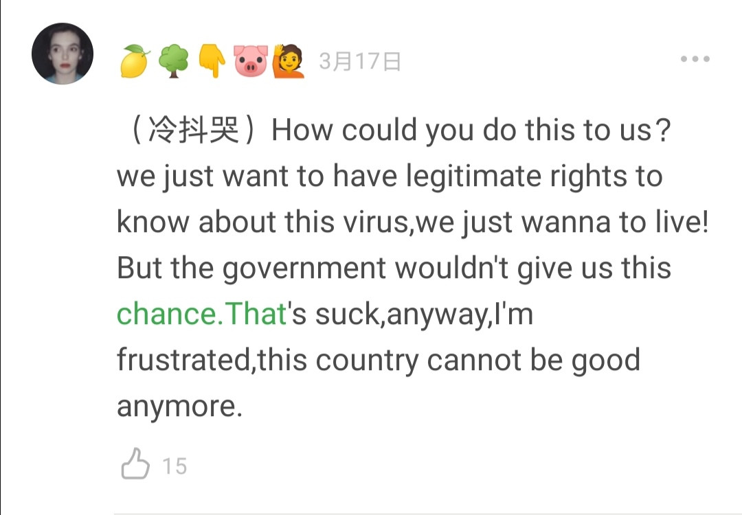 (冷抖哭)How could you do this to us?we just want to have legitimate rights to know about this virus,we just wanna to live!But the government wouldn’t give us this chance.That’s suck,anyway,I’m frustrated,this country cannot be good anymore.