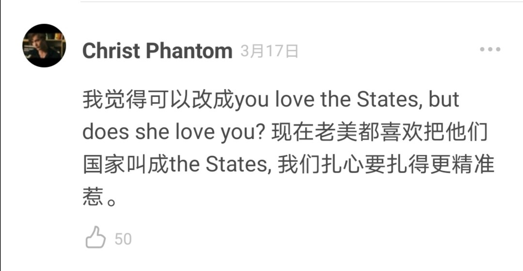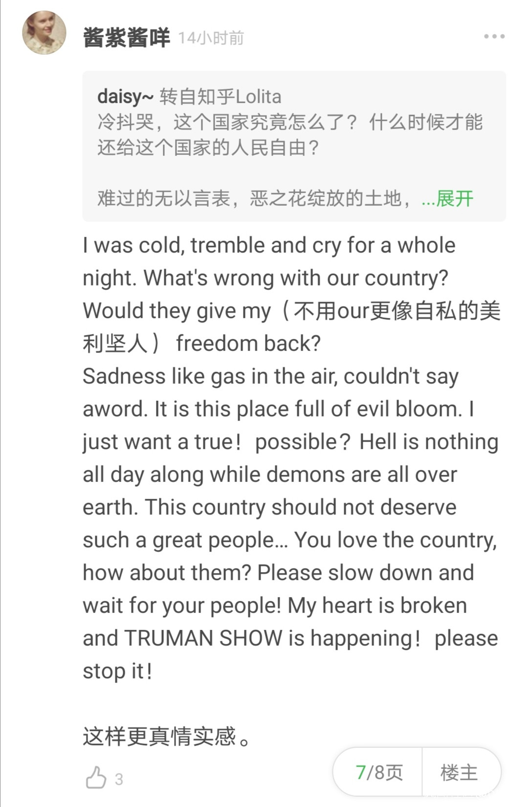 I was cold, tremble and cry for a whole night. What’s wrong with our country? Would they give my(不用our更像自私的美利堅人) freedom back?
