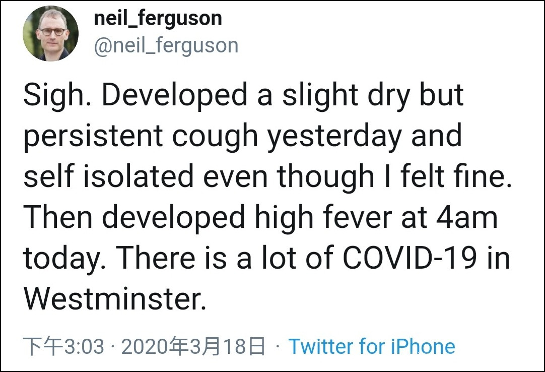 此前在18日時,弗格森教授就曾講述,自己前一天已經出現了乾咳、高燒的症狀。他第一時間選擇居家隔離↓↓