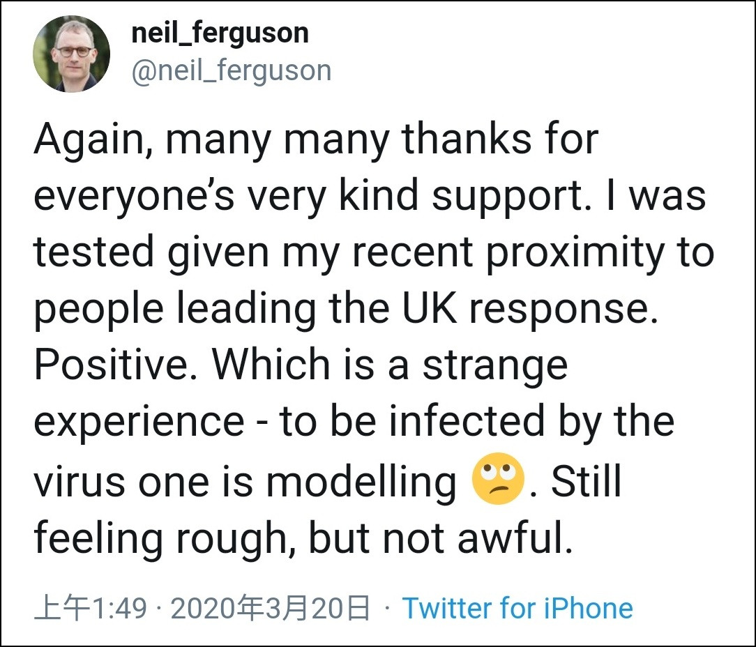 在上述社交貼文中,弗格森教授對於自己身為一個病毒學專家仍然沒能倖免感染感到驚奇:“這是一種奇特的體驗——被自己建模研究的病毒感染。我仍感艱難,但還不算糟糕。”他也補充説,從個人經歷上看可以説明倫敦市中心已經成為一個感染熱點。