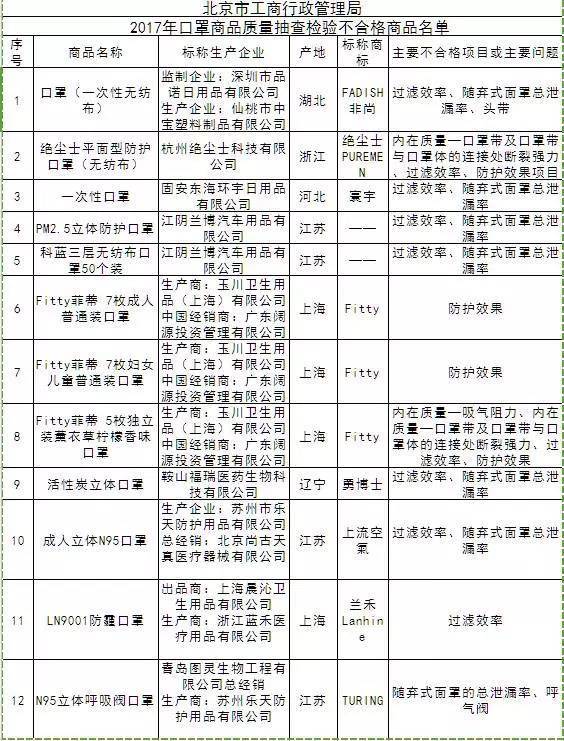2017年慧眼消費公眾號介紹的北京不合格口罩名單: