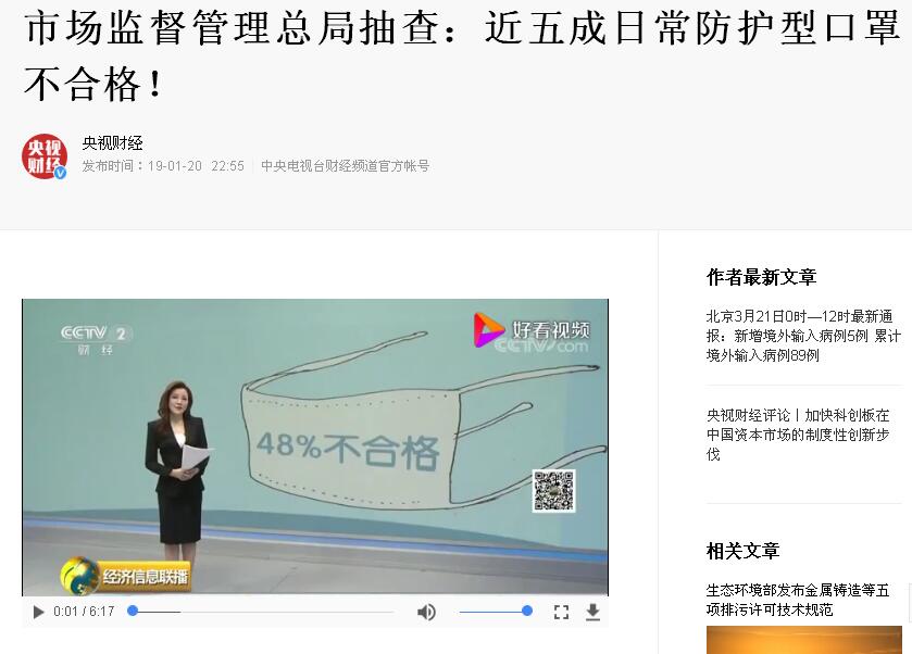 20:54 2020-3-21補充:評論區有人説非gov.cn的新聞不信。沒辦法,剛搜了個央視財經的百家號發的視頻文章,説40%口罩在防護效果或吸附率上抽檢不合格(防霧霾,防PM2.5,防花粉等等,理論上大多需要靜電駐極濾棉技術,因為要講吸附率標準,要講是不是KN90、KN95,醫用1級防護,必然涉及靜電濾棉和GB2626-2006國標,或GB18083-2010醫用防護國標)。