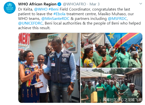 3月3日,剛果(金)最後一名埃博拉患者康復出院,治療中心門口歡聲笑語,慶祝這一輪長達19個月的埃博拉疫情中患者“清零”。世衞組織非洲區域辦事處主任莫提博士(Matshidiso Moeti)通過社交媒體表示:“經過一年多的抗疫工作,目前剛果(金)已沒有埃博拉病例。希望再過不久就能結束本次疫情。”