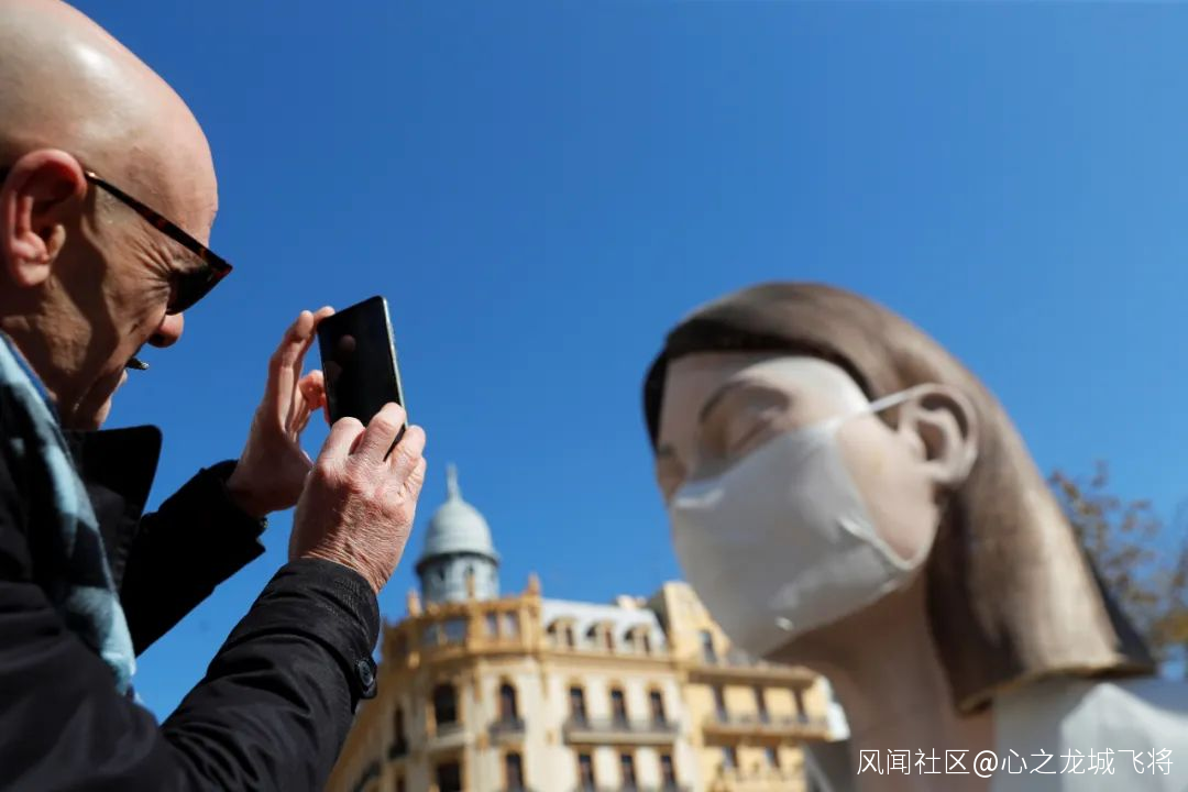 但今年,這裏卻破例留下了一尊法雅人偶。市政府保留了這座被稱為“禪修者”的巨型女子半身像,將它放置在巴倫西亞市中心的廣場上,併為它“戴”上了一個巨大口罩,以提醒人們:
