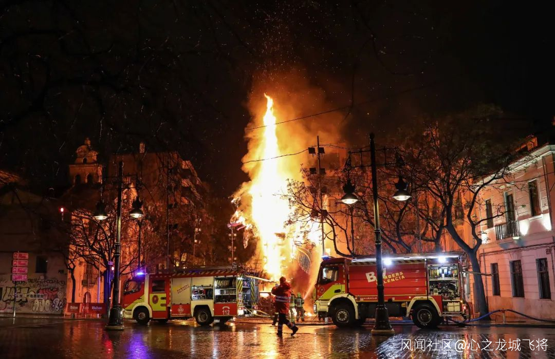 3月16日,在西班牙巴倫西亞,消防員在法雅節人偶燃燒完畢後滅火。新華社/歐新