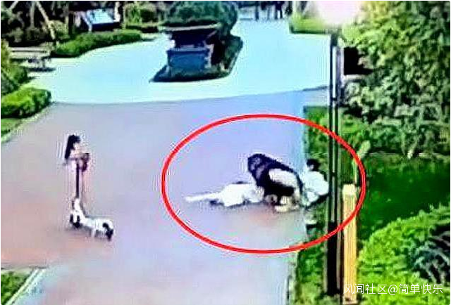 今年3月16日,廣東東莞某小區,據監控錄像顯示,下午六點四十分左右,有兩名小女孩正在園區內一處較為空曠的地段玩滑板車。隨後,另一名看起來年紀稍大的女孩牽着一條阿拉斯加(疑似在遛狗)從她們旁邊經過。