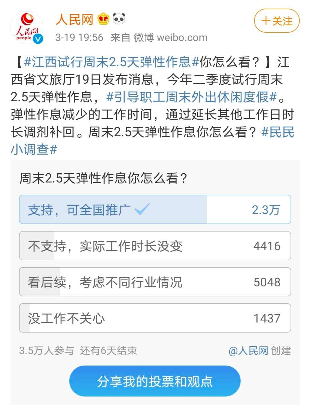 江西省將試行週末2.5天假 網友:支持 可全國推廣_風聞