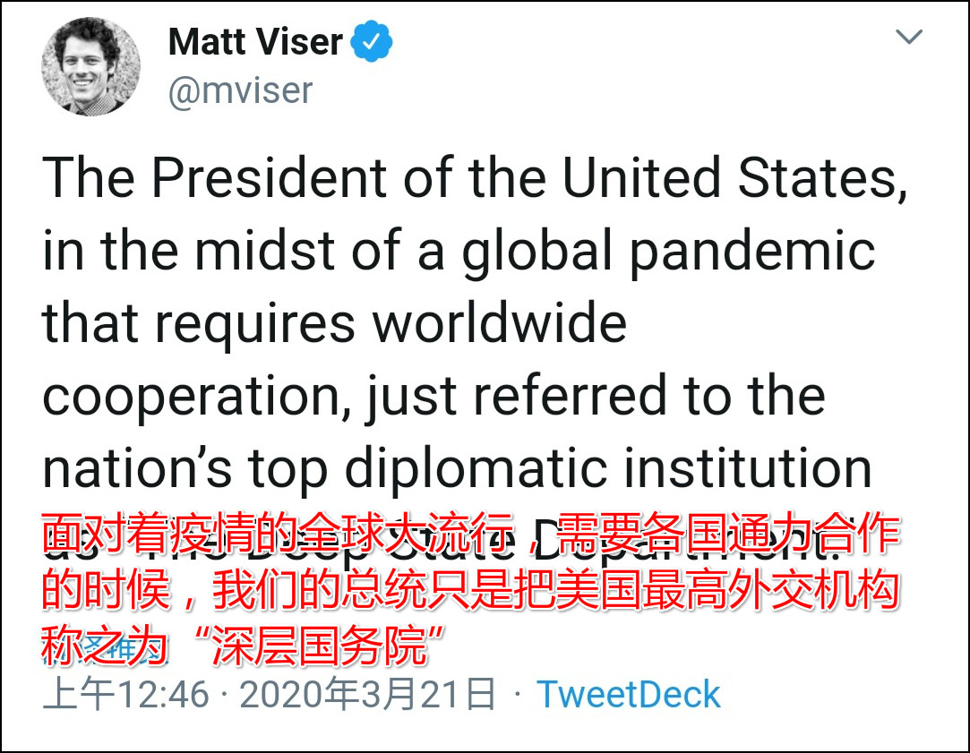 當特朗普在昨天的記者會上再次拋出“深層政府”論的時候,有記者隨後便向蓬佩奧發問:“在世界各地,有成千上萬的美國外交官正在為阻止疫情的傳播而努力時,總統卻將你工作的部門稱之為‘深層國務院’,你覺得合適嗎?”