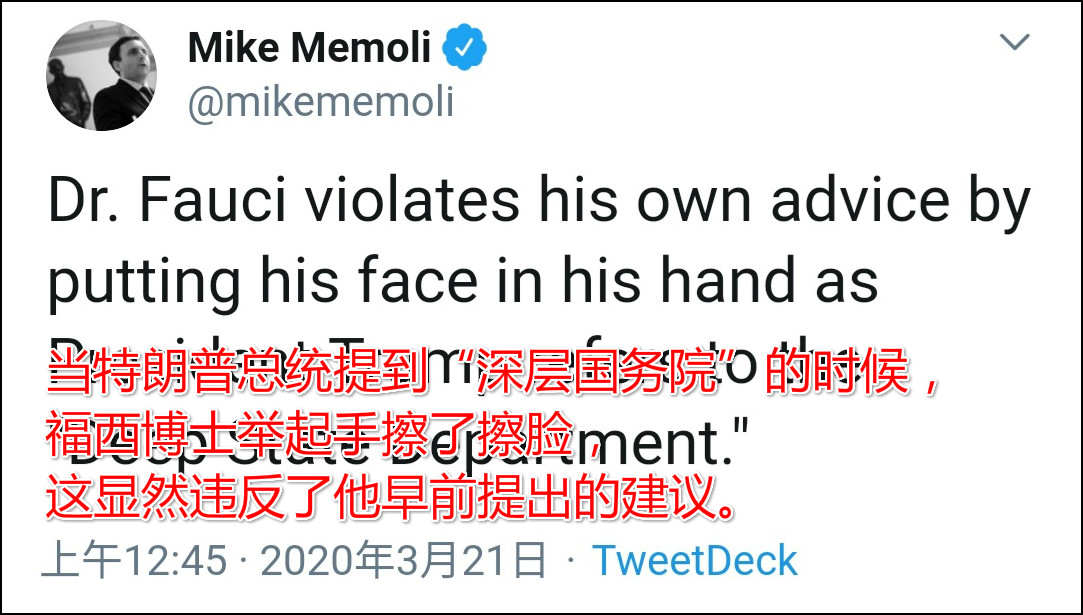 為了表達對蓬佩奧工作的信任,特朗普脱口而出,希望前者能夠回到“深層國務院”(Deep State Department)工作,而不是站在聚光燈下遭受媒體記者的刁難。這個回答,出乎意料到讓站在一旁的福西博士都忍不住扶額掩面。