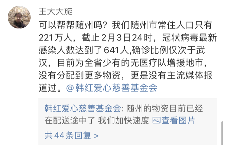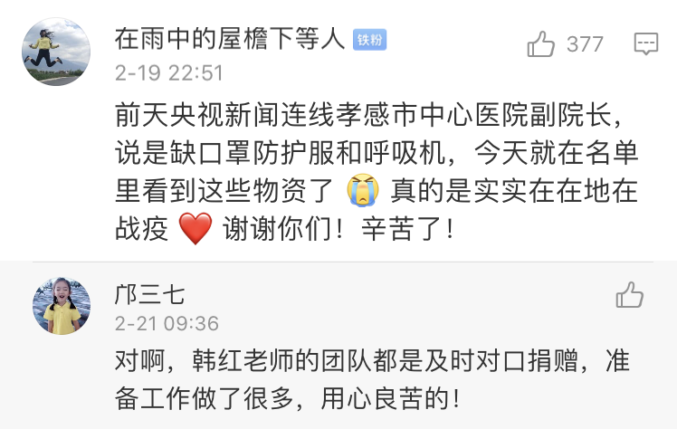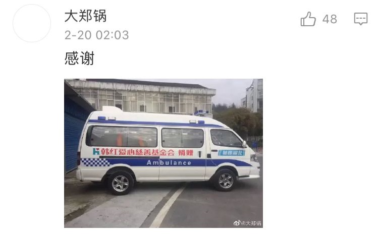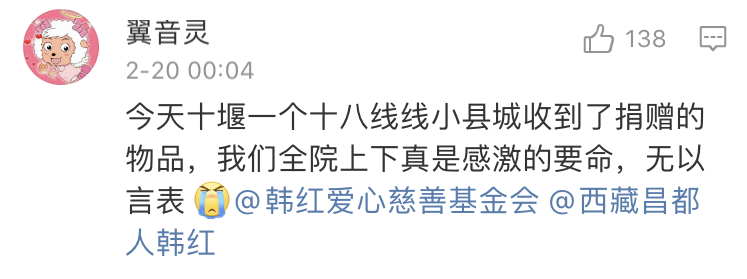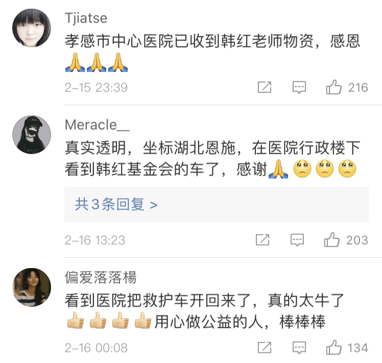 在基金會的官方微博**@韓紅愛心慈善基金會** 裏,它在每一天晚上都會發布當天的項目進展。此次馳援武漢行動,從1月25日,到階段結束的3月19日,每一天,都有物資運送公示。