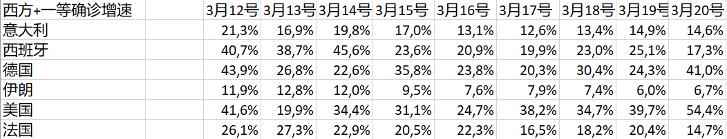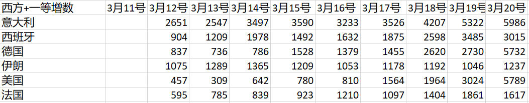 **美國今天新增5732,增速達到兩天就可以翻番的41%!照這個速度,明天它就可以勇奪第二名,一週以內,就可以趕上意大利,奪得頭名。**這期間美國中央政府和地方政府一定會有激烈的對應措施出台。(比如大範圍封城甚至封國之類。)但要顯出效果,尚需至少一週吧。但是,美國在大範圍的進行測試,這總是比法國、英國的“不測就沒有”的政策來得科學正確。學鴕鳥把腦袋扎進沙堆裏,終究也是躲不過敵手的。
