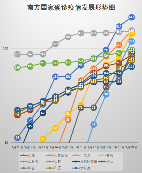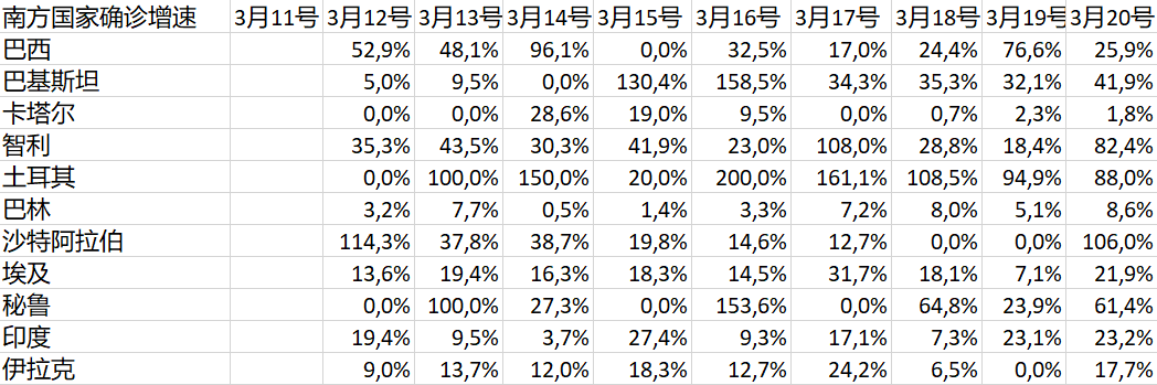 餘下的六個國家,三個在拉美(巴西、智利、秘魯),兩個在西亞(沙特阿拉伯和土耳其),一個在南亞。類型很不接近。但增速都很高,都屬於2-4天就可以翻番的那一類。所幸它們出發得都晚,到現在基數都還不大,兩個星期之內,大概還發展不到嚇人的地步。等歐洲的局勢穩定下來,世界就應當可以騰出手來幫助它們,希望它們不會成為繼東方和西方之後,成為第三個主戰場。看增速,土耳其最嚇人。希望很快有轉機。