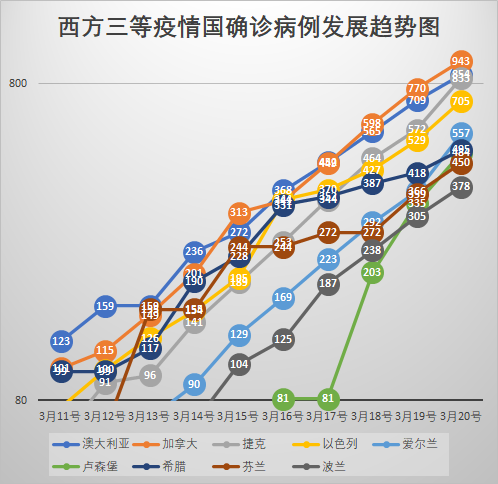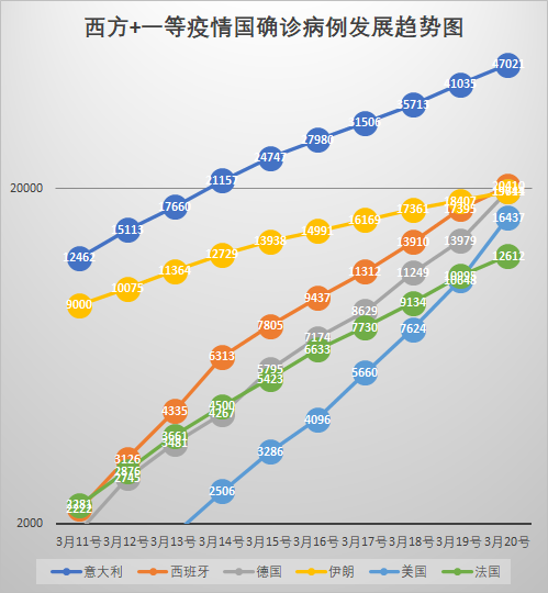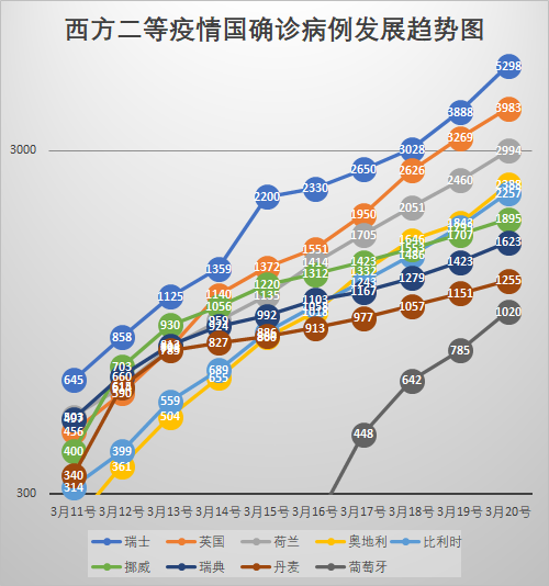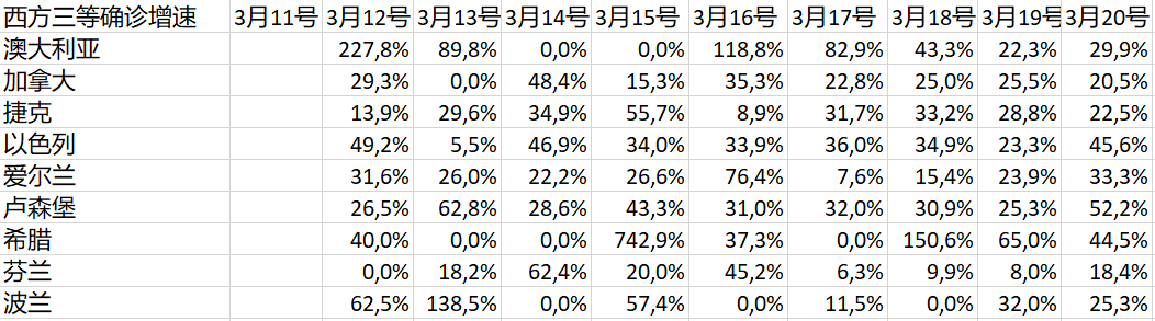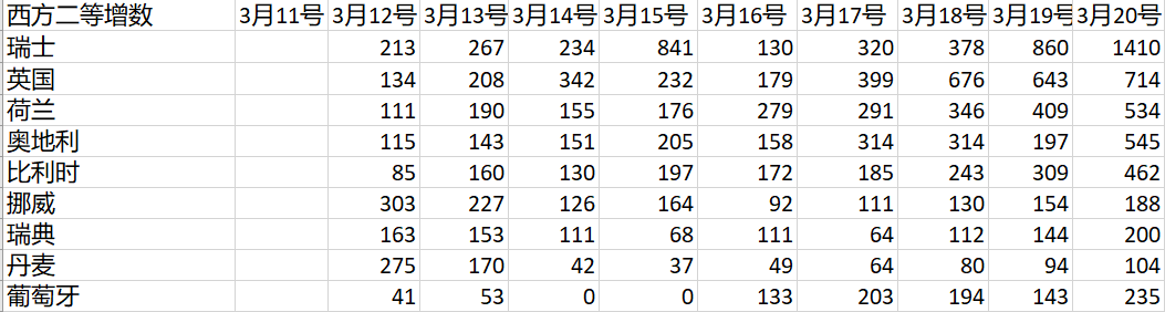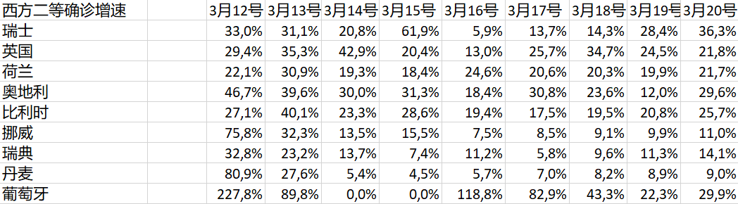 現在來看西方第二等9國,數字都在1000以上7000以下。注意,它們都是西歐國家,屬於西方文明僅次於第一撥的五個國家的準核心部分。它們的特點就是齊頭並進,扇面很小。例外的只有葡萄牙,它是後起之秀。除了丹麥、瑞典、挪威3個國家,其餘的6個,增速都在20%以上,甚至高達36.3%!它們的累計數字會在3-4天之內翻番,3到10天之內,大體都會進入萬級。那三個走得慢的,如果能越走越慢,可能就進不了萬級而率先到頂了。我預祝它們率先成功,給其它歐洲國家做出榜樣。但這三個國家都很小,決定不了大局。