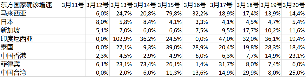 這裏列出的八個東方政體,(換個稱呼,因為有兩個不是國家。)也有幾種情況。日本、新加坡、中國香港和中國台灣的情況類似,就是管控得很好,增長得很慢,極大概率不會爆發。新加坡、香港和台灣最近幾天有點小爆發。但由於這些政體的質量都很好,總量又低,應該可以嚴密管控,不至於出大簍子。