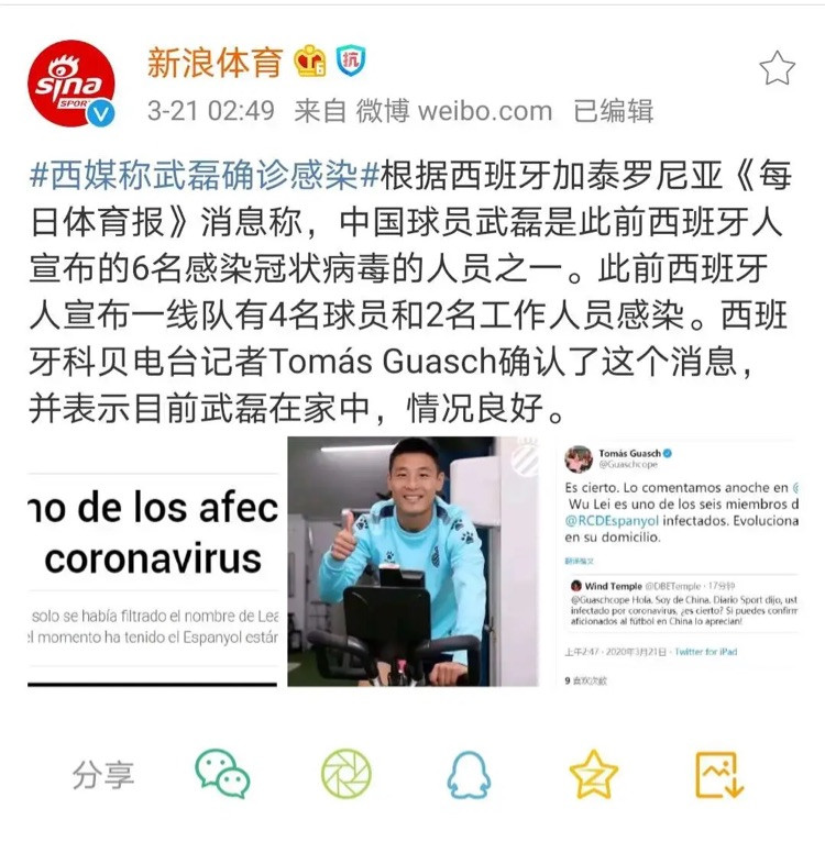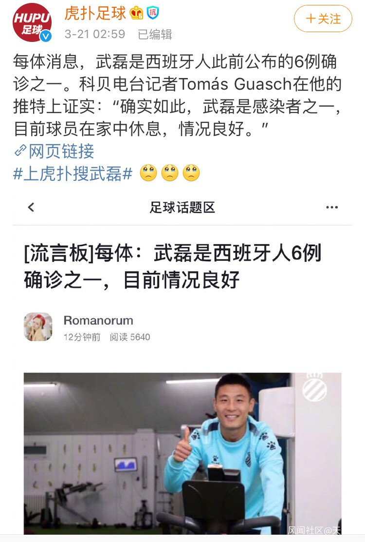 西班牙科貝電台記者:武磊確認感染新冠病毒,現在家中修養!_風聞