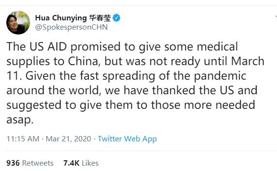 然後,在誇下這番海口大約 1 個多月後,美國所謂的 " 援助 " 物資才在中國的疫情已經基本上得到控制後才 " 姍姍來遲 “,以至於中國外交部發言人華春瑩昨日不得不建議美國將這筆物資轉贈他國。