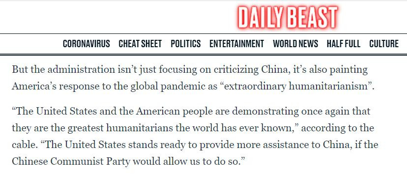 但更噁心的還在後面。根據《野獸日報》網站報道,除了要求聯邦政府的官員在對外發表講話時各種污衊中國,甩鍋中國,將美國的一切防疫不力都説成是中國的責任(“Everything is about China”),這份美國國務院的文件還要求官員們 " 美化 " 美國對於疫情的應對,將美國描述成 " 偉大的人道主義者 “。” 美國和美國人民再次證明了他們是世界上最偉大的人道主義者,美國已經準備好提供更多支援給中國,如果中國共產黨允許我們這麼做的話 “,這份文件寫到。