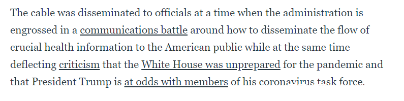 《野獸日報》稱,這份當地時間週五(20日)發給美國國務院官員的電報為美國官員如何回答有關新冠病毒的問題或談論新冠病毒,以及白宮涉及中國的回應方面發佈了觀點指導。這些談話要點最初來自美國國家安全委員會,因為電報其中一部分上面一行寫着“國家安全委員會(NSC)”。其內容甚至包括指責中共“重視自己的名聲多於人民的疾苦”。報道稱,一位爆料的官員説,“一切都是關於中國。我們被告知要盡一切可能把這些信息傳遞出去,包括在記者招待會和電視節目上。”