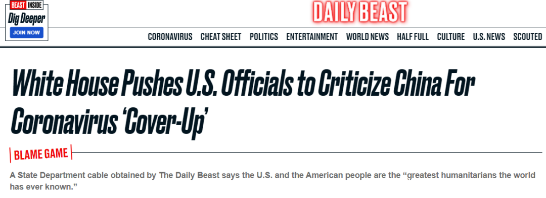 然而,還沒等咱們中國網民先去指出這段內容中眾多失實的部分,美國《野獸日報》網站就已經先諷刺起了這番攻擊中國的言辭:這份文件下發給官員們的時間,恰恰是特朗普當局被美國的疫情搞得焦頭爛額,生怕疫情影響了特朗普的連任,正忙着推卸白宮應對疫情不力的責任的時候。