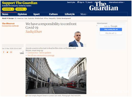 【環球網報道 記者 張曉雅】“這一病毒不是‘中國病毒’。它不尊重國界,將會影響地球上的每一個國家。”3月21日,英國倫敦市長薩迪克•汗在《衞報》發表題為《我們有責任對抗新冠病毒》的文章,呼籲英國承擔起對抗新冠肺炎疫情的責任。文中稱新冠病毒不是“中國病毒,”而面對這場危機,美國似乎不願發揮團結領導作用,那麼歐洲和英國必須加快步伐負起責任。