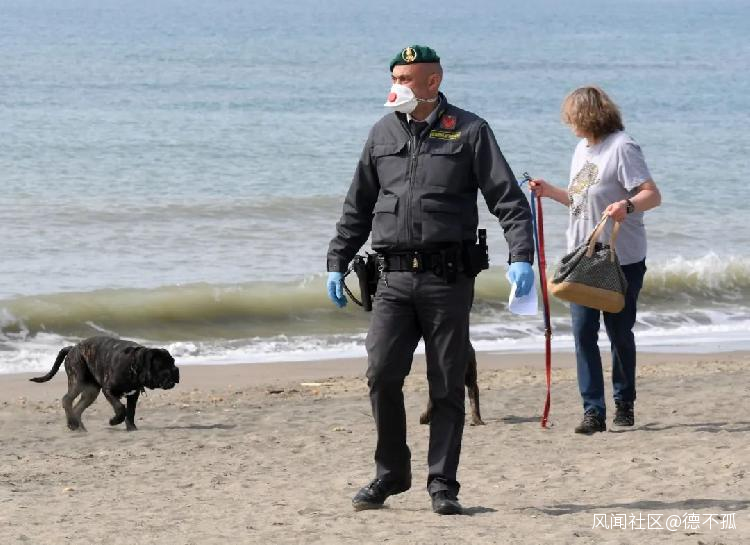 3月21日,在意大利羅馬附近的奧斯蒂亞,意大利憲兵檢查一名沙灘上遛狗的女子。新華社發