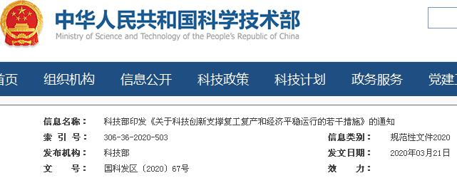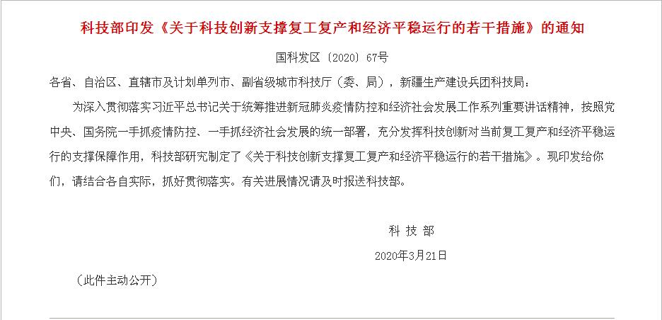 科技部《關於科技創新支撐復工復產和經濟平穩運行的若干措施》_風聞