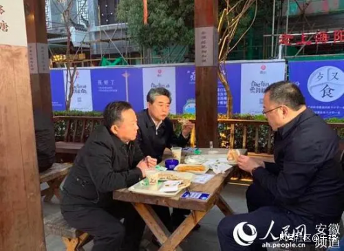 安徽省委常委、常務副省長鄧向陽和安徽省委常委、合肥市委書記宋國權陪同中央調研組進行調研時,自費品嚐當地小吃。(圖片來源:人民網安徽頻道)