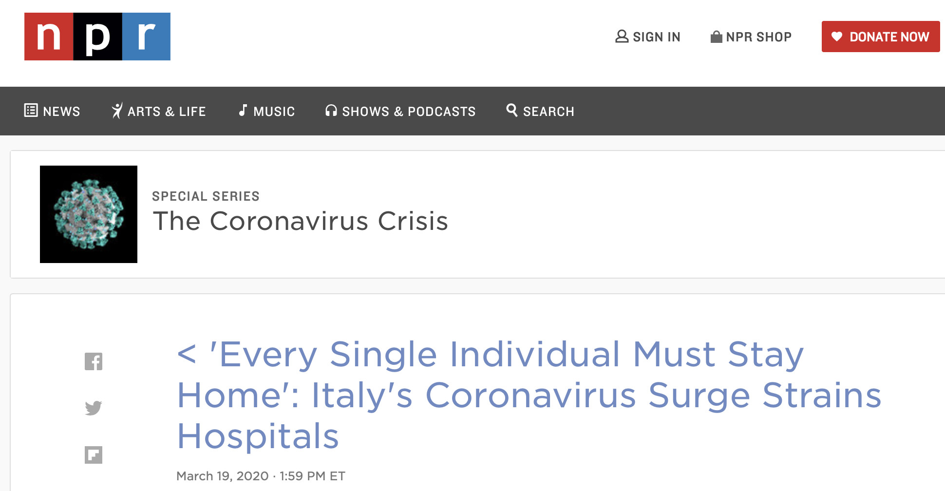 **NPR主持人伯格里:**截至週四晚,意大利的死亡人數已經超過3400人。意大利為應對疫情,已經進入戰時緊急狀態。